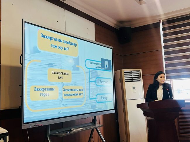 Түүнчлэн, хуулийн хэрэгжилтийг хэрхэн хангах, захиргааны шийдвэр гаргах явцтай уялдуулах зохион байгуулалтын талаар албан хаагчид асуулт асууж санал солилцон, авсан мэдээллийн талаар үнэлгээ өгөх боломжтой үр дүнтэй сургалт боллоо.