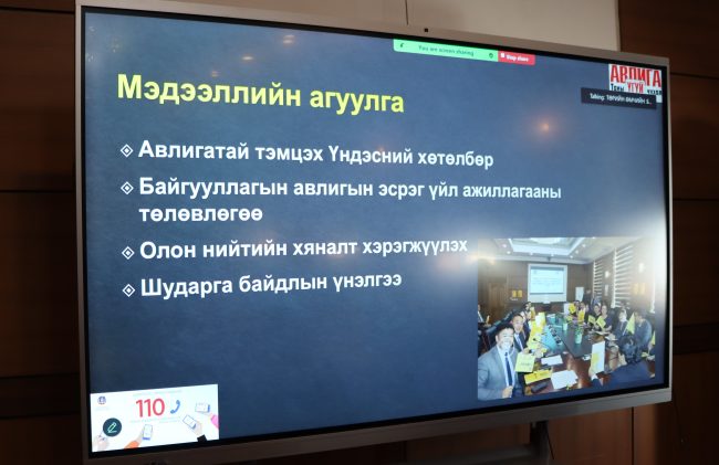 Уг сургалтын хүрээнд тус байгууллагын албан хаагчдад авлигын эсрэг үйл ажиллагааг эрчимжүүлэх шаардлага хийгээд Авлигатай тэмцэх үндэсний хөтөлбөрт тусгагдсан холбогдох арга хэмжээг хэрхэн хэрэгжүүлж, үр дүнг нэмэгдүүлэх, Засгийн газрын 2021 оны 109 дүгээр тогтоолоор баталсан “Олон нийтийн хяналтыг хэрэгжүүлэх журам”-ыг хэрэгжилтийг хангах талаар мэдээлэл өгч, арга зүйгээр хангахад чиглэсэн танилцуулга хийв.