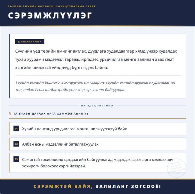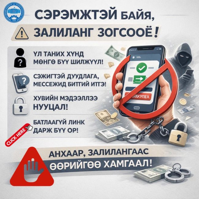 Төрийн өмчийг актлах, дуудлага худалдаагаар хямд үнээр худалдах тухай хуурамч мэдээлэл тарааж, иргэдээс урьдчилан мөнгө авах, Төрийн нэр барьж залилах гэмт хэрэг бүртгэгдэж байгаа тул Иргэд олон нийт та бүхэн эрх бүхий байгууллагын албан ёсны мэдээлэлд үндэслэн шийдвэрээ гаргаж байхыг анхааруулж байна.